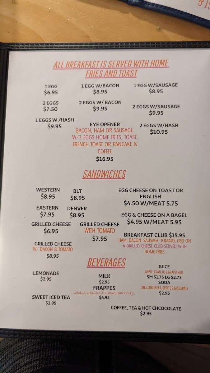 The sandwich menu is another highlight, featuring delicious choices like the crispy BLT, the satisfying Denver sandwich, and the cheesy Egg & Cheese On A Bagel. The Grilled Cheese With Bacon & Tomato is a crowd favorite, while the Eastern sandwich adds a little extra flavor. If you're looking to share, you can enjoy a House Salad, crispy Homemade Chicken Fingers, or Sweet Potato Fries, among other sides.
